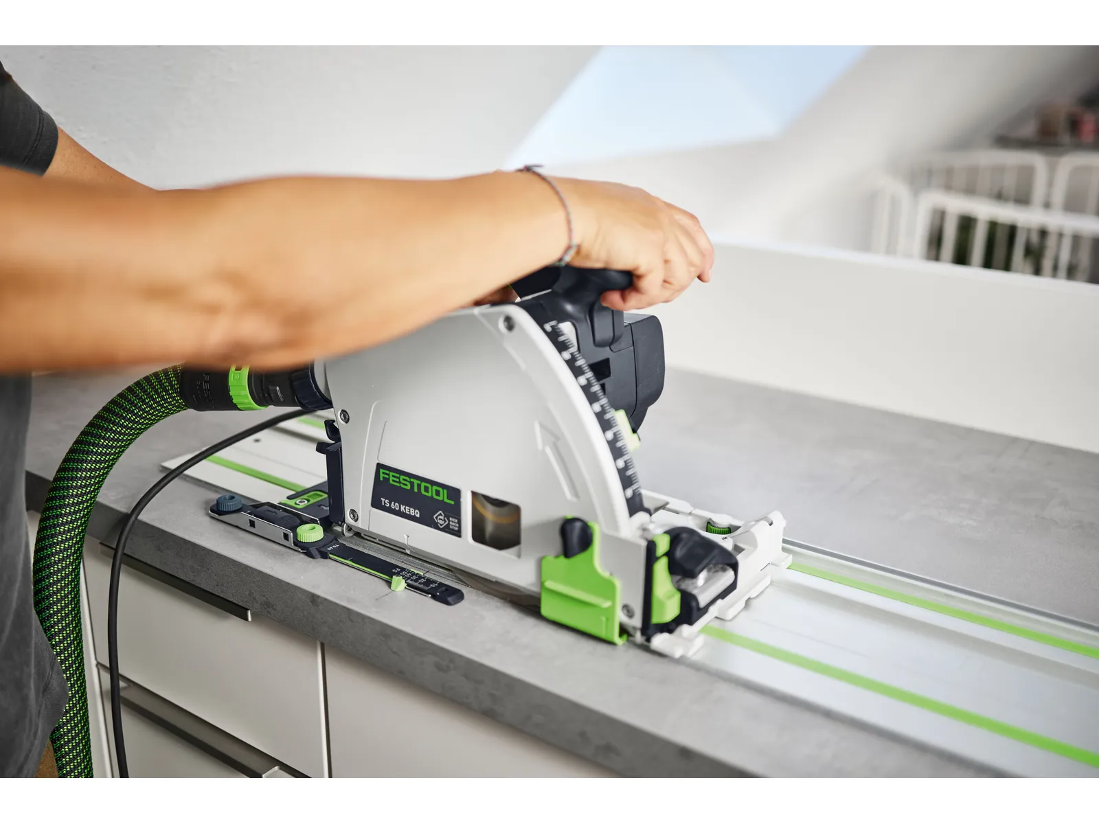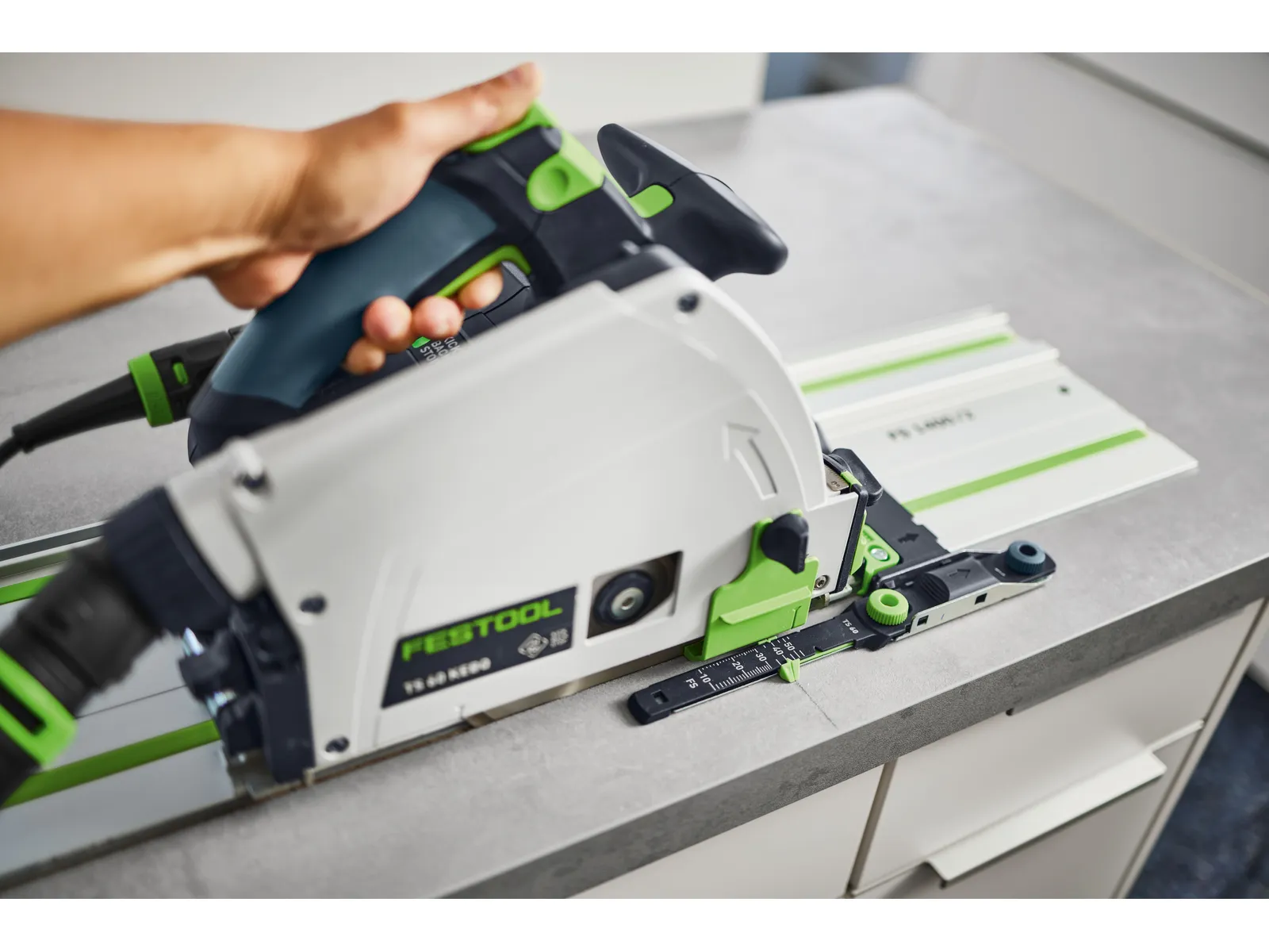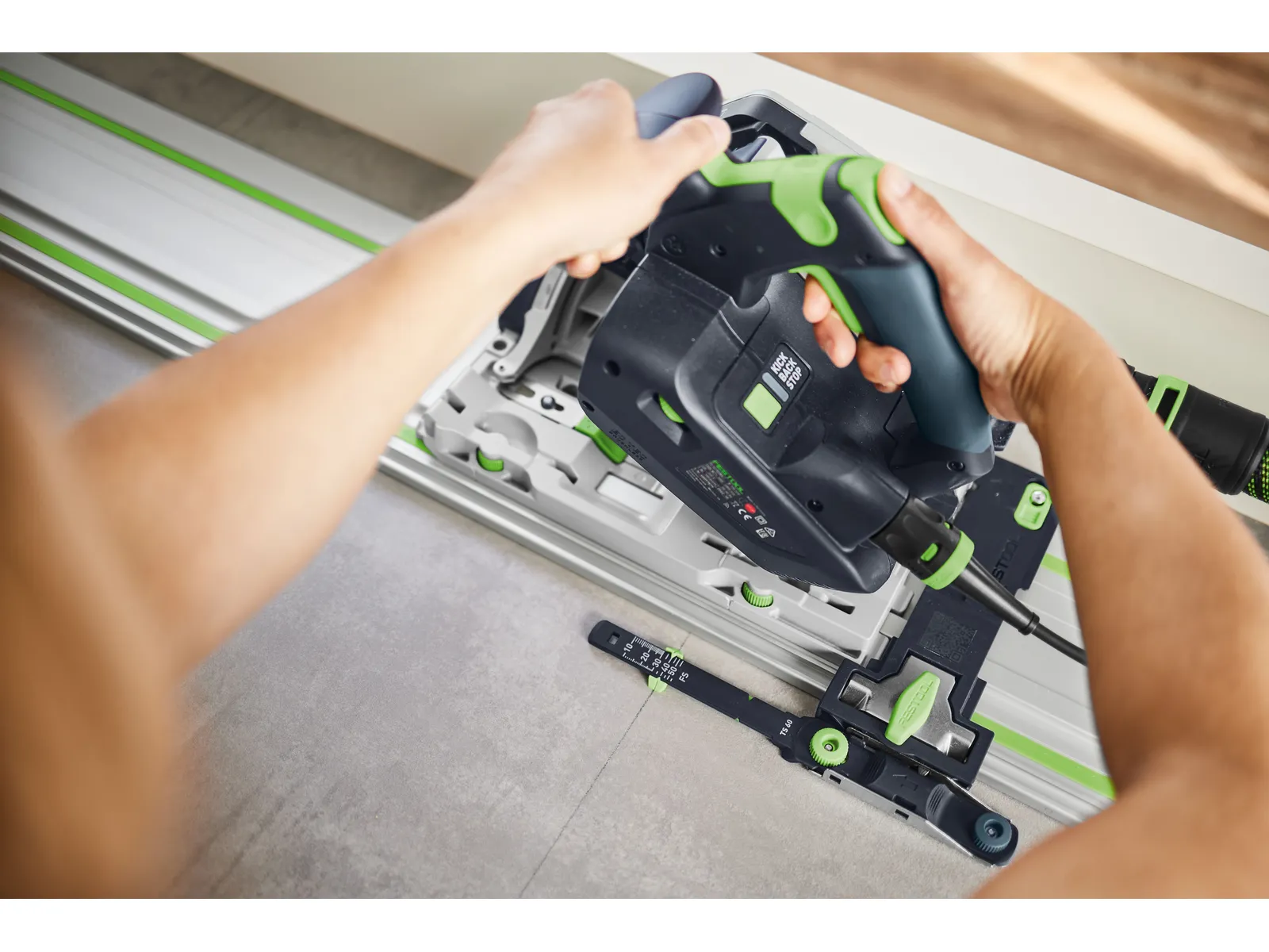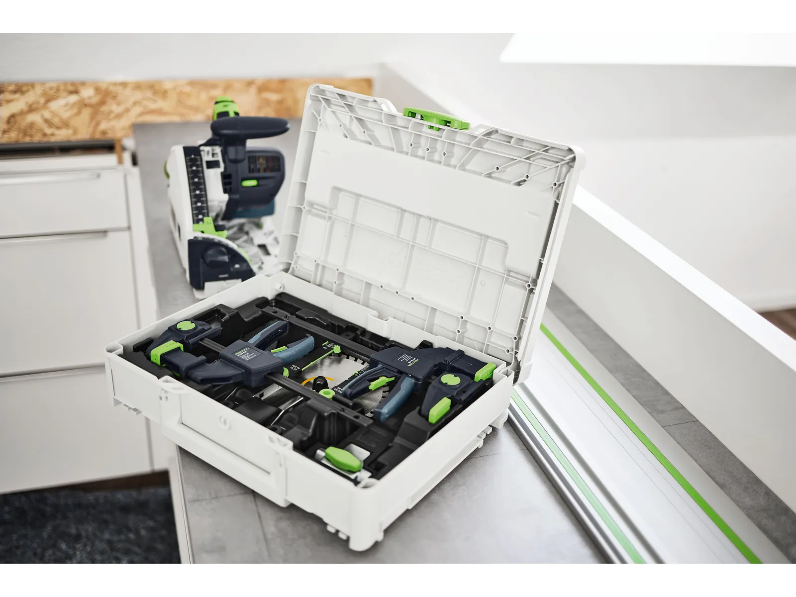 Det här setet är det perfekta komplementet till din sänksåg: med positionsindikatorn för sänksnitt kan du vara säker på att träffa sågklingans exakta in- och utgångspunkt vid alla sågdjup. Sätt bara in den uppifrån i styrskenans spår och fäst den. Ställ sedan in markeringsindikatorns skala på sänksågens djupinställning, rikta in den mot ritsen och gör utskärningarna exakt där du behöver dem. Med passande snabbtvingar fäster du styrskenan på arbetsobjektet med ett enkelt handgrepp, för ett säkrare och mer kontrollerat arbete. I Systainern finns också plats för sågklingor och förbindningsstycken till styrskenan – så att du alltid har systemtillbehören till hands.